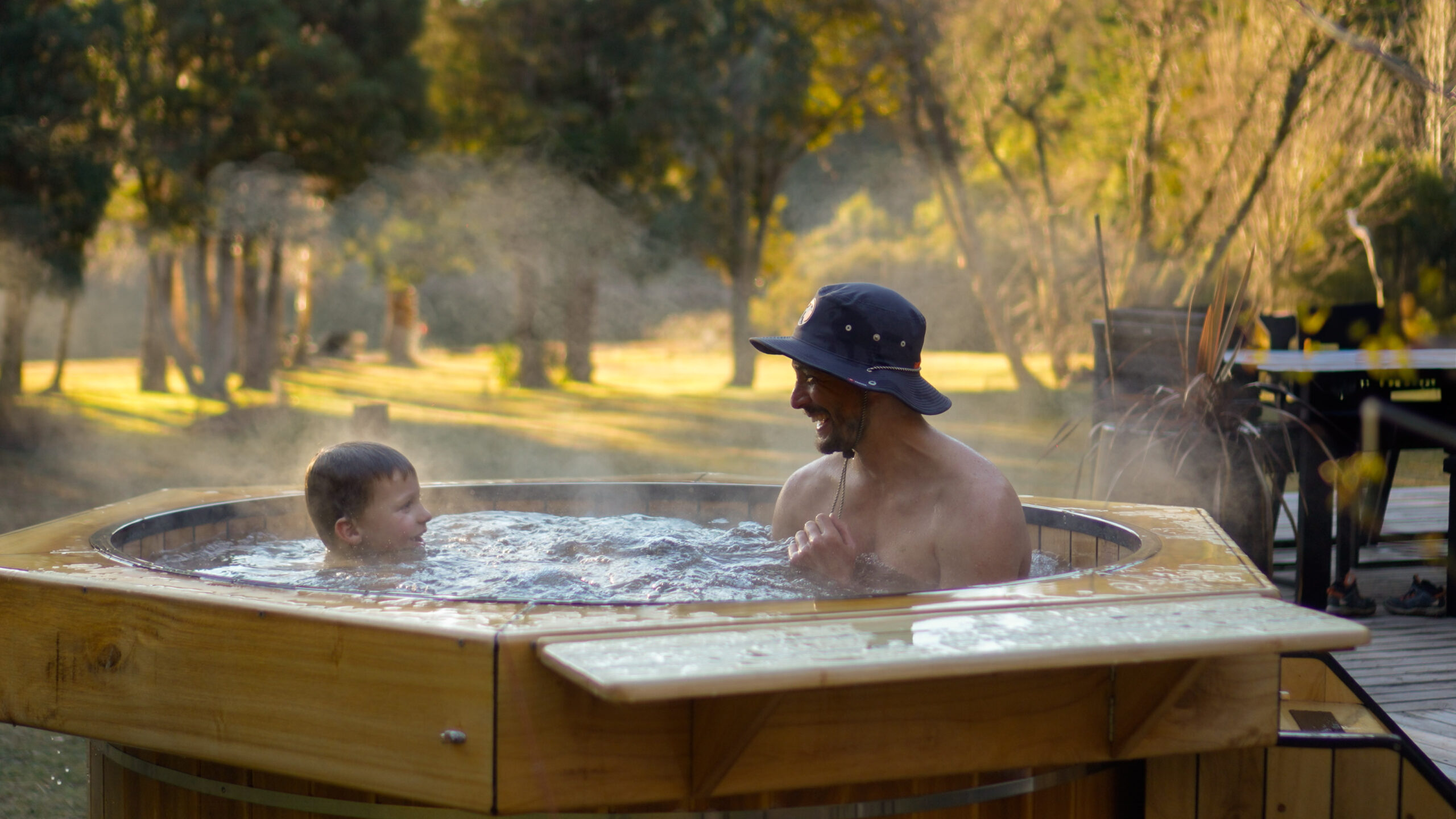 Each is equipped with a Scottish shower with chromotherapy, dry sauna, open-air jacuzzi, Tromen wood stove, Russian stove, underfloor heating, Starlink Wi-Fi, full tableware, television, coffee machine, and a privileged view of the lake.